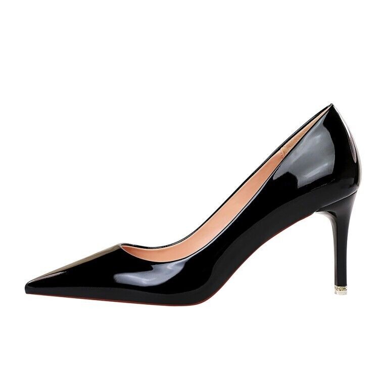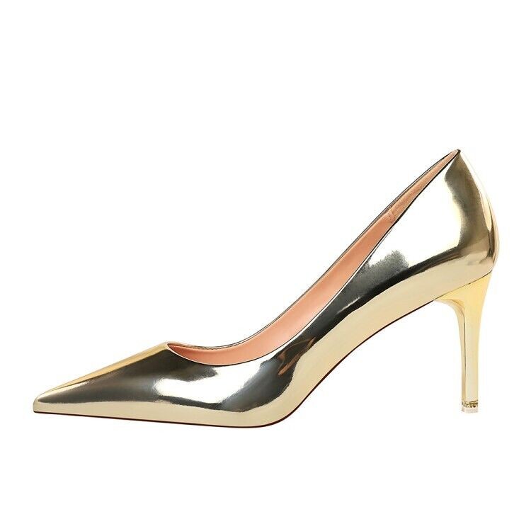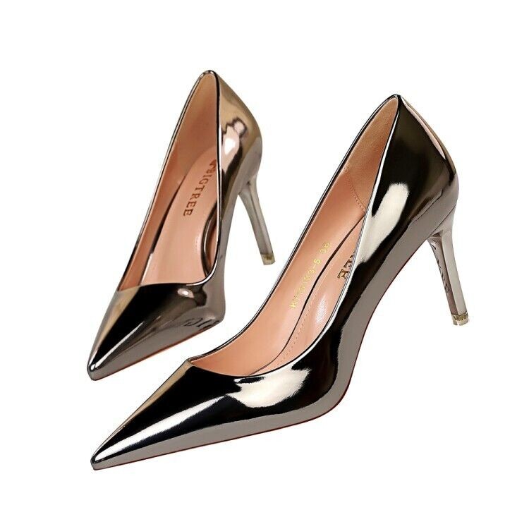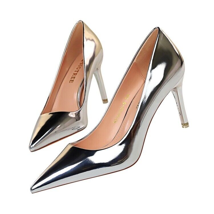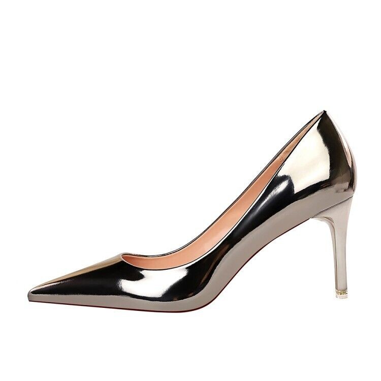 Ladies Club Party Shoes Metallic Synthetic Leather High Heels Pumps UK Size S601